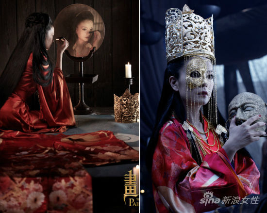 趙薇劇中紅裙造型,寬大的刺繡裙擺彰顯應(yīng)有霸氣感覺。金色頭冠讓皇家氣勢彰顯,鬼魅感面具和面紗呼應(yīng),展現(xiàn)劇中人物復(fù)雜性格。