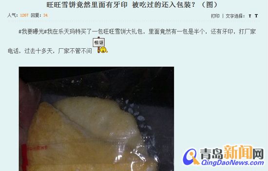 青島新聞網訊 帶牙印的雪餅,你吃過嗎?近日,市民孫先生買到了被網友們戲稱為“限量版”的一包尚未開封食用便帶著“牙印”的旺旺雪餅,他表示自己從2012年4月起,將此事向旺旺集團廠家投訴已近2個月,至今卻仍未收到來自廠家的最終回復。記者近日對此事進行了采訪。