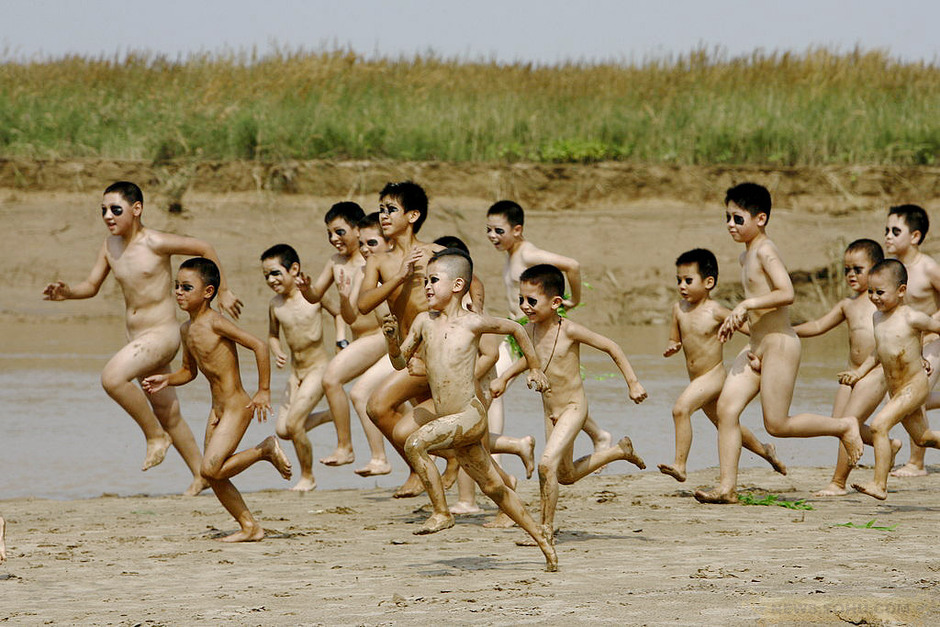 2010年8月6日,河南鄭州市花園口黃河灘地,“熊貓人”趙半狄發(fā)起27名男孩脫衣裸奔的行為藝術表演。孩子們在黃河邊上一遍遍地奔跑,希望通過努力換來一座孤老院。寄予“裸露”有成效。