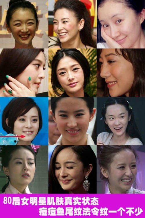 80后的女星也都20多有些快30了。從粉絲貼吧和粉絲聊天樓找來了不少高清、沒有PS的圖片,才發(fā)現(xiàn),女明星的肌膚問題值得憂心。楊冪的皺紋、劉詩詩的法令紋、眾多女星臉上的痘痘,令不少粉絲吃驚不已。