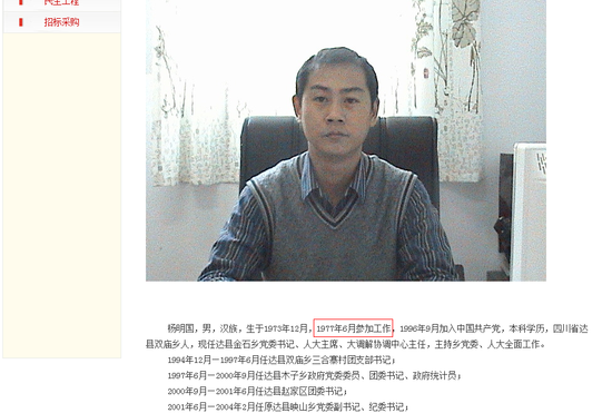 該媒體截取的圖片資料顯示,四川達(dá)縣金石鄉(xiāng)黨委書(shū)記楊明國(guó)“生于1973年12月,1977年6月參加工作”。