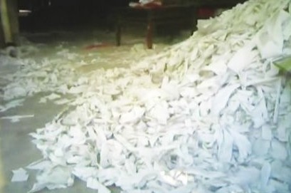 ![]() 堆放在廠房地上的回收紙生產(chǎn)原料。