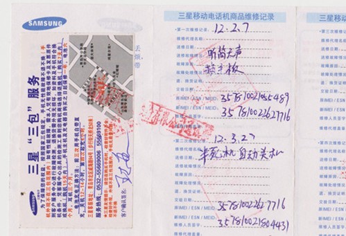 ????在王先生提供的《三星移動(dòng)電話機(jī)商品維修記錄》中,記者看到,交驗(yàn)時(shí)間、故障原因、維修人員簽字處均為空白,第二次維修記錄更沒有注明故障原因,甚至第三次的手機(jī)檢測(cè)根本就沒有登記,三星售后工作人員證實(shí),“公司系統(tǒng)中并沒有相關(guān)檢測(cè)記錄”。