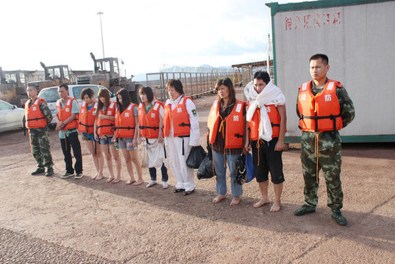 經(jīng)核實(shí),當(dāng)時(shí)舢板/快艇共載12人;被救起共9人(6女3男),其中越南籍5人(3女2男)、中國(guó)籍4人(3女1男);仍未被救起3人(2女1男)。圖為被救出的落水者,邊防官兵在旁邊看守著。