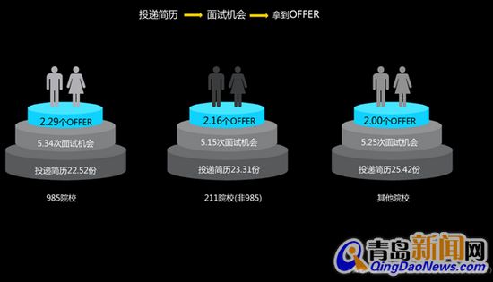 ????2.、總體來看,今年畢業(yè)生平均投遞簡歷的數(shù)是24.06份,獲得的面試機(jī)會(huì)平均是5.27次,最終拿到的OFFER的平均數(shù)是2.12個(gè)。對(duì)比來看,985院校學(xué)生在求職中優(yōu)勢明顯,在數(shù)量上略有優(yōu)勢外,在企業(yè)質(zhì)量上明顯高于普通院校。