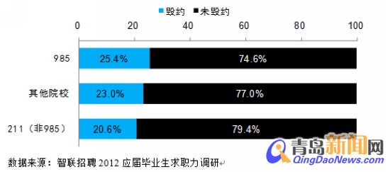 ????另外,從毀約畢業(yè)生所在的院校類別來看,985重點(diǎn)院校畢業(yè)生的毀約率最高,達(dá)到了25.4%,其次是其他類大學(xué),其比例為23.5%,排在第三位的是211(非985)大學(xué),占比為20.6%。