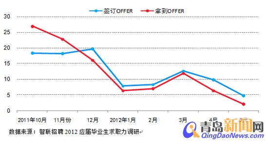 ????調(diào)查顯示,2012年應(yīng)屆畢業(yè)生的簽約旺季集中在2011年的10-12月份,12月簽約率達(dá)到峰值19.8%。這三個(gè)月的總簽約率達(dá)到了56.4%。而2011年10月是畢業(yè)生拿到OFFER比例最多的月份(27.0%),隨后拿到OFFER的畢業(yè)生人數(shù)逐月減少,到2012年1月份,拿到OFFER的畢業(yè)生比例僅有6.4%,2-3月份略有回升,4月份以后又開始回落。