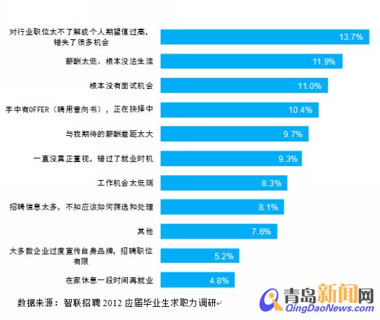 ????6、未成功簽約的原因數(shù)據(jù)顯示,期望就業(yè)的畢業(yè)生中仍未就業(yè)的首要原因是對(duì)職位不太了解或個(gè)人期望過高,使得自己錯(cuò)失了許多機(jī)會(huì),其比例占到了13.7%;其次是認(rèn)為薪酬過低,無法滿足自身的生活,占11.9%,還有11%的同學(xué)根本未獲得面試的機(jī)會(huì)。
