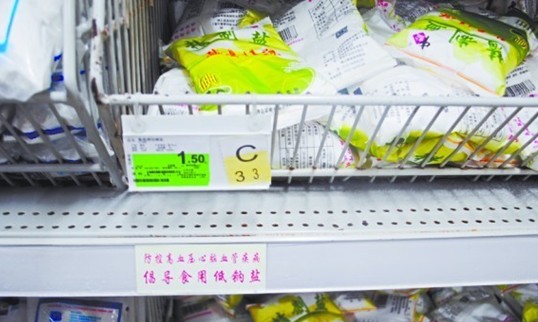 超市食用鹽貨架上貼有防控慢性病的溫馨提示。