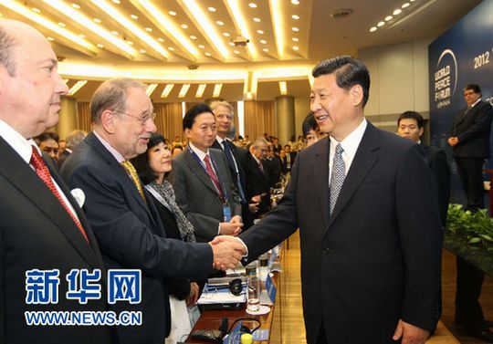 資料圖:7月7日,國家副主席習(xí)近平在北京出席“世界和平論壇”開幕式并以“攜手合作共同維護(hù)世界和平與安全”為題致辭。這是開幕式后,習(xí)近平與出席開幕式的外國前政要握手。 (劉衛(wèi)兵 攝)