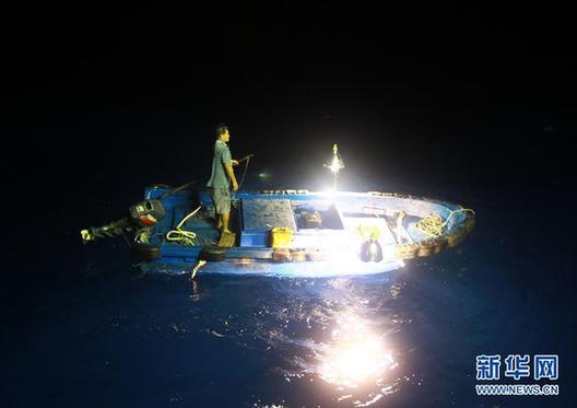 漁民駕駛小艇吸引魚群,以便漁船圍網(wǎng)捕撈(7月16日攝)。