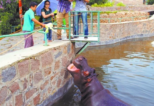 ????五年前,一只剛滿兩歲的非洲河馬,從海南來到位于青島開發(fā)區(qū)的青島森林野生動物世界。過了五年的單身生活后,考慮到這只雄性河馬的生活習性,最近工作人員從煙臺請來一只一歲多的雌性河馬,算是給這對河馬定了親。據(jù)介紹,等小河馬三歲多發(fā)育成熟后,將會同雄性河馬“結(jié)為連理”。