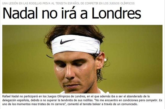 ????騰訊體育 北京時間7月19日消息,倫敦奧運會開賽前曝出重大消息,據(jù)馬卡報報道2008年北京奧運男單金牌得主、西班牙網(wǎng)球巨星納達爾因膝傷退出本屆倫敦奧運會,無緣衛(wèi)冕男單金牌。同時之前納達爾被選為本屆奧運會西班牙隊的開幕式旗手,而現(xiàn)在他的突然退出使得旗手人選再成疑問。