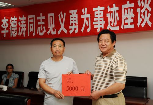 ????7月20日上午,膠州市召開李德濤見義勇為事跡座談會,該市交通運輸局黨委做出了在全市交通運輸系統(tǒng)開展向李德濤學(xué)習(xí)的決定。該市交通運輸局向李德濤頒發(fā)了蘋果平板電腦、中達(dá)公司黨委頒發(fā)了5000元的獎金,以勉勵他見義勇為的壯舉。