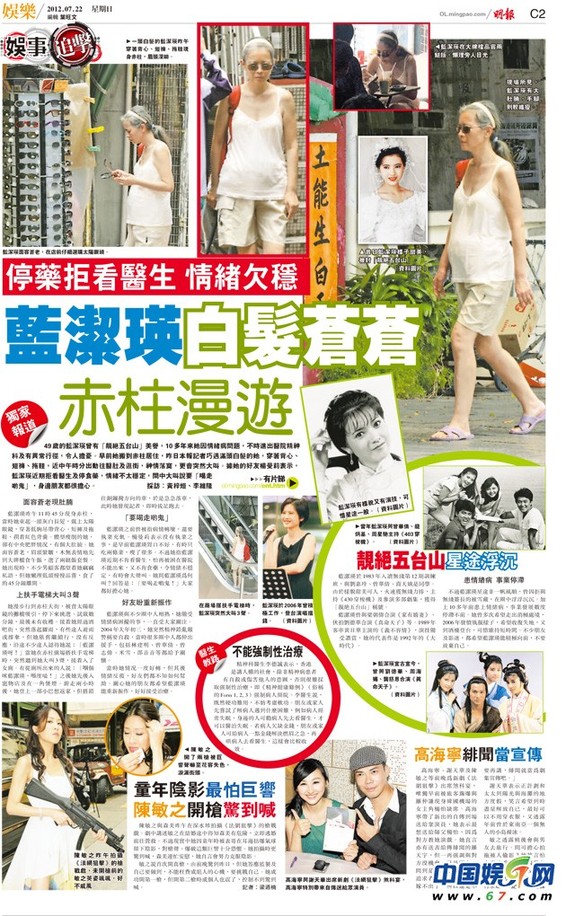 49歲的藍潔瑛曾有“靚絕五臺山”美譽,10多年來她因情緒病問題,不時進出醫(yī)院精神科及有異常行徑,令人擔憂。早前她搬到赤柱居住,昨日本報記者巧遇滿頭白發(fā)的她,穿著背心、短褲、拖鞋,近中午時分出動往醫(yī)肚及逛街,神情落寞,更會突然大叫。