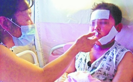 ????24日上午,記者在青醫(yī)附院小兒血液科病房見到了正在接受治療的馬騁,他的眼睛周圍有些深紅色,身上也有不少深紅色的地方,就像被人打了一樣,臉上還貼著降溫貼?!斑@是化療后的不良反應,之前化療的時候還好好的,這一次突然這樣了。”馬騁的母親李彩勤說,不光皮膚外邊這樣,孩子嘴里也血淋淋的。