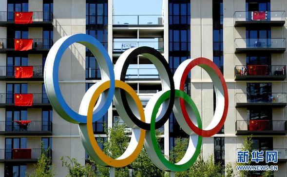 圖為7月24日拍攝的掛在奧運村宿舍陽臺上的國旗。