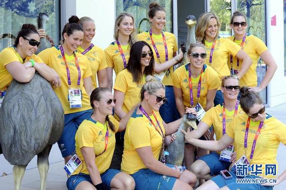 圖為7月24日,澳大利亞女運動員們在奧運村內(nèi)與鴕鳥雕塑合影留念。