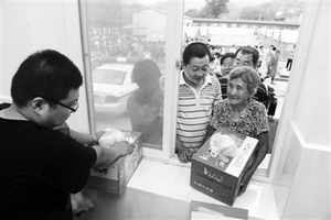 昨日下午,北車(chē)營(yíng)村完全小學(xué)災(zāi)民安置點(diǎn),村委會(huì)正組織發(fā)放賑災(zāi)物品,村民排隊(duì)領(lǐng)取礦泉水、方便面、饅頭等食品。