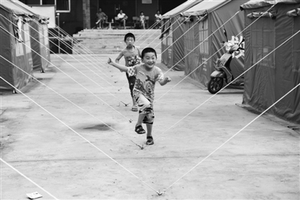 孩子們?cè)谂R時(shí)安置點(diǎn)玩耍。新京報(bào)記者尹亞飛攝