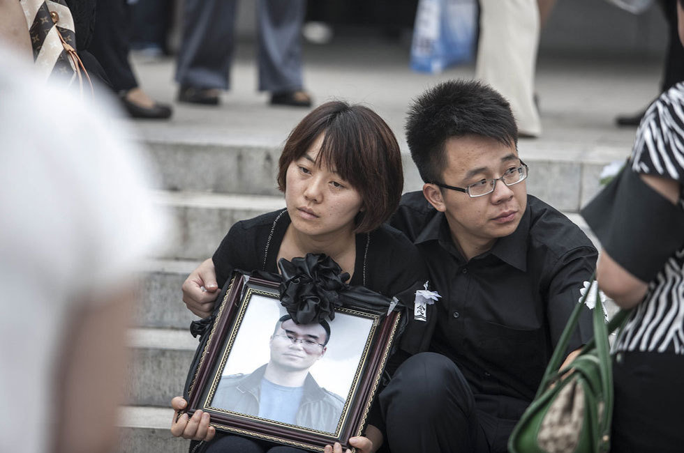 2012年7月25日,在北京廣渠門(mén)橋下遇難的駕車(chē)人丁志健的追悼會(huì)在八寶山舉行,親友同事趕來(lái)為他送行。圖為丁的妻子懷捧遺像,神情絕望。圖/李昊