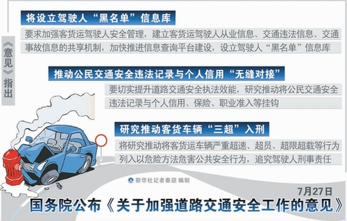 ????記者7月27日從中國政府網(wǎng)獲悉,國務(wù)院日前發(fā)布關(guān)于加強(qiáng)道路交通安全工作的意見,要求加強(qiáng)客貨運(yùn)駕駛?cè)税踩芾?,建立客貨運(yùn)駕駛?cè)藦臉I(yè)信息、交通違法信息、交通事故信息的共享機(jī)制,加快推進(jìn)信息查詢平臺建設(shè),設(shè)立駕駛?cè)恕昂诿麊巍毙畔?。意見指出,將研究推動將客貨運(yùn)車輛嚴(yán)重超速、超員、超限超載等行為列入以危險(xiǎn)方法危害公共安全行為,追究駕駛?cè)诵淌仑?zé)任。