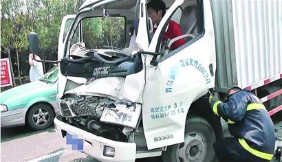 昨日下午2時許,一輛廂式貨車沿著正陽路向東行駛至程哥莊附近的紅綠燈時,由于剎車不及,當(dāng)場與前面的一輛大貨車撞在一起,前擋風(fēng)玻璃當(dāng)場碎成碴子飛進(jìn)駕駛室,變形的方向盤將司機的雙腿卡住。
