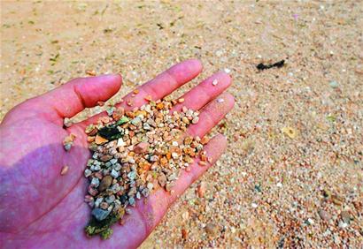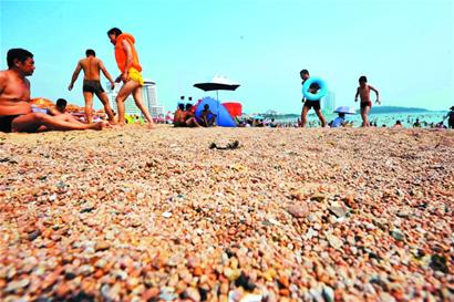 昨天,記者來到了第一海水浴場??拷R路一側的沙灘遠看是黃白色的沙子,走近一看卻是如綠豆大小的石子,還摻雜了一些海蠣子皮,腳踩在上面有一種麻酥酥的感覺。繼續(xù)往大海的方向走去,取而代之的是沙子和石子混合在一起的“沙灘”,走起來硌腳的感覺會輕一些。在較為濕潤的靠近海的地方,地上的沙灘都是一些白色、半透明的石子細沙。調查發(fā)現,一浴東西兩側的沙質有所不同,浴場的東側沙灘沙質比較細膩,西側沙灘則較粗。