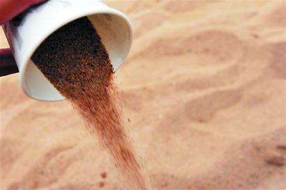 記者捧起一把沙子仔細(xì)觀察,發(fā)現(xiàn)沙子里摻雜了很多