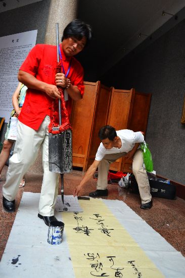 傳說(shuō)中,關(guān)公的青龍偃月刀重82斤,而“重筆書法達(dá)人”王懷忠的這只毛筆,鑲上一塊巨石,重達(dá)36斤。但見他舉重若輕,筆走龍蛇,一首王之渙的《登鸛雀樓》呈現(xiàn)在大家面前。他說(shuō),用如此重筆,可以練臂力,練氣勢(shì),練神韻。