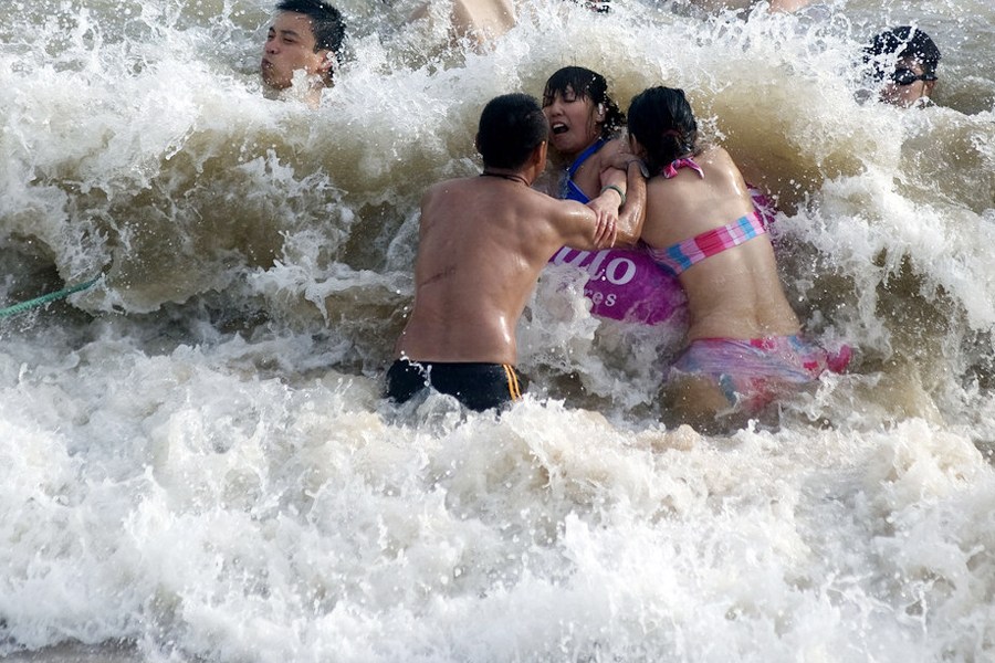 8月2日,青島第一海水浴場,眾多游客在臺風來臨前在大浪中戲水。