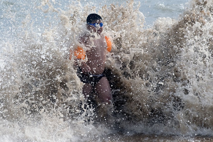8月2日,青島第一海水浴場,眾多游客在臺風(fēng)來臨前在大浪中戲水。