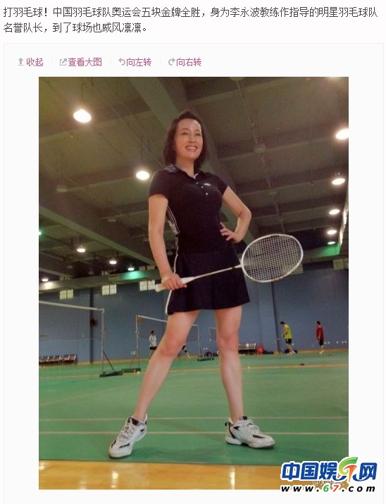 劉曉慶打羽毛球慶祝林丹奪冠 球拍打到自己險(xiǎn)毀容