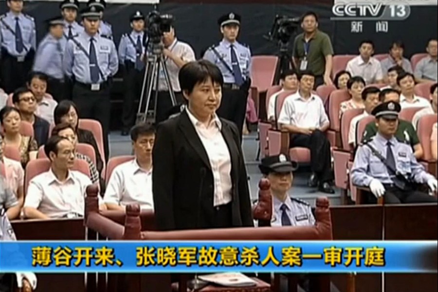 2011年11月13日晚,薄谷開來到尼爾·伍德所住的重慶市南山麗景度假酒店16棟1605室與其飲酒、喝茶,趁尼爾·伍德醉酒嘔吐后要喝水之機,將事先準(zhǔn)備并交給張曉軍攜帶的毒藥倒入尼爾·伍德口中,致尼爾·伍德死亡。圖為被告人薄谷開來在被告席上。