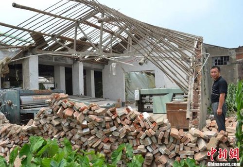 8月9日17時15分左右,一場龍卷風(fēng)襲擊了江蘇姜堰市蔣垛鎮(zhèn)的界河、興港、蔣垛等8個村,造成了三百多間房屋損毀,四百多頭牲畜死亡,一百多戶農(nóng)戶受災(zāi),所幸未造成重大人員傷亡。中新社發(fā)周勝濤 攝