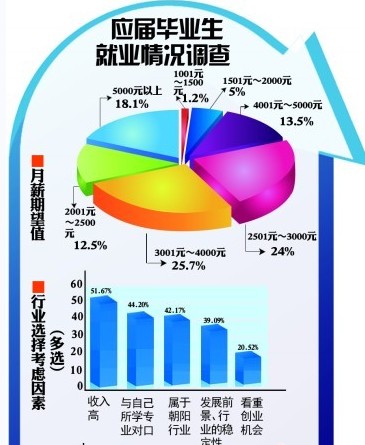 ????今年整體數(shù)據(jù)同去年相比,整體薪酬期望高于去年。每月1501元至2000元之間下降了6個(gè)百分點(diǎn),2001元至2500元之間下降了11個(gè)百分點(diǎn),2501元至3000元之間基本持平,3001元至4000元之間則上升了近5個(gè)百分點(diǎn),4001元至5000元之間則上升了近8個(gè)百分點(diǎn),5000元以上也上升了8個(gè)百分點(diǎn)。