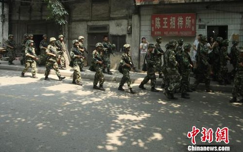 圖為大量武警官兵在此地準(zhǔn)備進(jìn)行搜山行動(dòng)。
