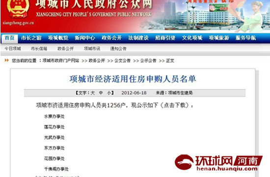 環(huán)球網河南頻道6月20日周口綜合報道:6月18日,河南省周口項城市住建局公布了項城市經濟適用房(惠民小區(qū))申購人員名單。據調查,在這份經過項城市住建局、紀檢和監(jiān)察部門的重重審核最終確定的1256名(戶)名單中,有相當一部分申購人都