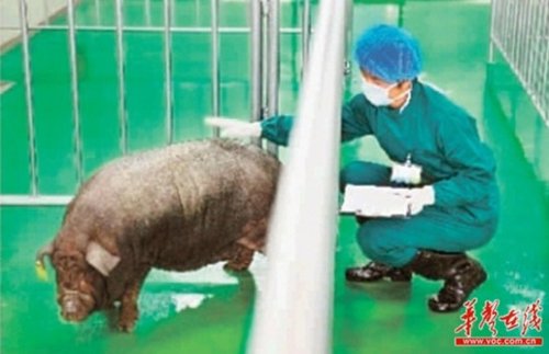 穿著隔離服的工作人員,不時出來檢測、化驗(yàn)?!拔覀円ㄆ跈z測它們的營養(yǎng)狀況,保證營養(yǎng)均衡;還要調(diào)節(jié)它們的情緒,帶它們玩玩具。”王維教授介紹,達(dá)到“醫(yī)用級供體豬”的標(biāo)準(zhǔn)很高,目前供體培育中心的整座豬舍完全密封,裝有現(xiàn)代化空氣過濾裝置、淋浴器等多種設(shè)施,豬食和餐具全部高壓滅菌,飲水過濾后滅菌。