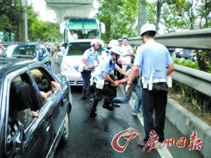 廣州市公安交警部門通報:9月7日17時30時許,民警在東風西路康王路口查扣一輛涉嫌無證駕駛和有被盜搶嫌疑的小型汽車(車輛號牌:粵NM22××)時,該車駕駛人曾某某抗法后逃逸,后被執(zhí)勤交警在內環(huán)路B線市一中入口處截停并制服。