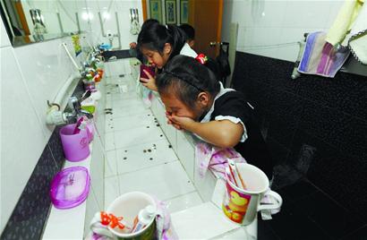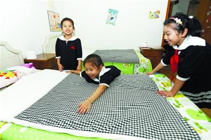 前天晚上6時30分許,記者來到這里,住在宿舍樓3樓的一年級小學生們正在輪流洗澡,在生活老師的幫助下,兩名孩子一起走進浴室,自己往身上抹肥皂、沐浴液,每個動作都很嫻熟。“開學剛入住的時候,大部分孩子什么都不會,現(xiàn)在這些孩子的動手能力提高了很多。”學校住宿部主任徐靜梅說。