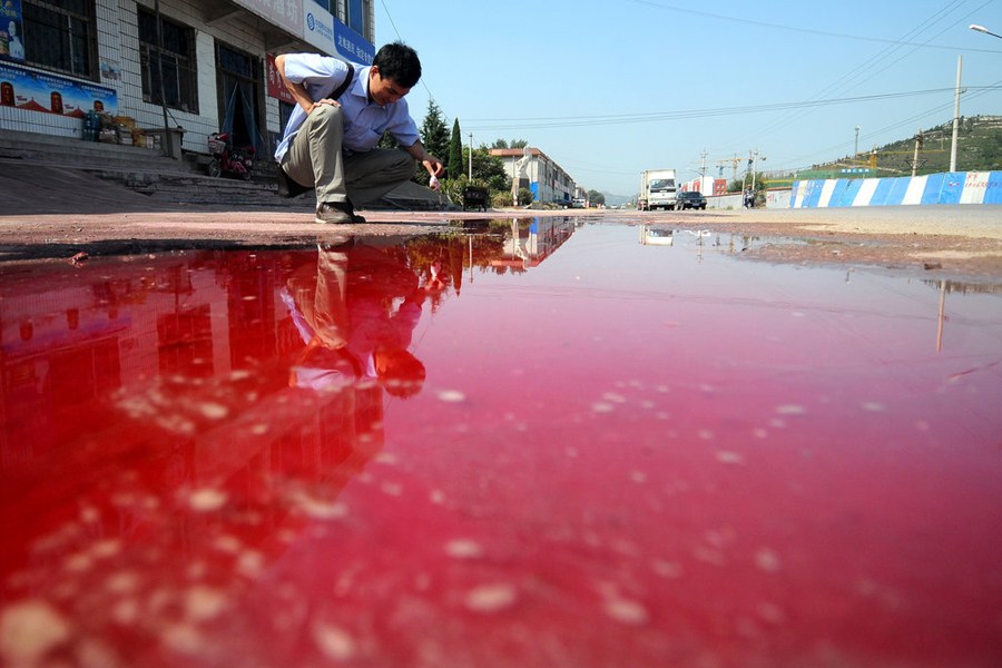 近日,山東省濟南市,一村莊似遭紅色污染,一夜之間路面均變成了紅色。據(jù)悉是因為高速路上一輛車上掉下來一袋子化學(xué)品,正好落在了高速路下的一間汽修廠內(nèi)。經(jīng)多部門及時行動查出了村莊被染紅的“元兇”為堿性玫瑰精。圖為路面淌著紅色的水。