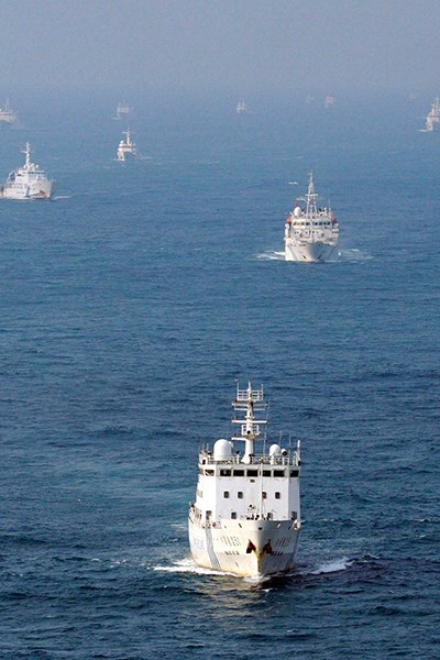 9月18日,共有包括中國海監(jiān)及漁政在內(nèi)的12艘公務(wù)船相繼進(jìn)入釣魚島附近海域;19日上午,又新增一艘中方公務(wù)船。至此,中方在釣魚島附近海域巡航的公務(wù)船只已達(dá)到14艘,其規(guī)模前所未有。圖為航拍照片,展示了中國海監(jiān)船、漁政船和日本海上保安廳的巡邏艦(右一和左二)。