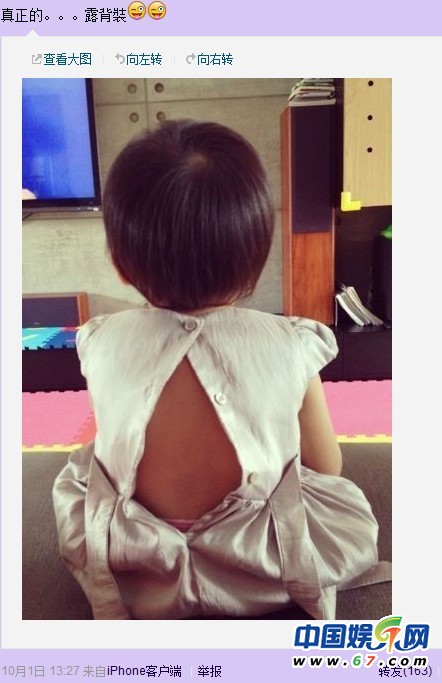 中國娛樂網(wǎng)訊 10月1日,蔡少芬在網(wǎng)上曬出一張女兒湯圓“露背裝”照片,并加以調(diào)侃:真正的。。。露背裝。引來網(wǎng)友紛紛贊美:“好美的露背裝”、“太性感了”。