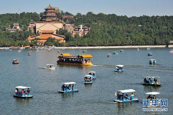 10月1日,游客乘船游覽北京頤和園?!?/p>