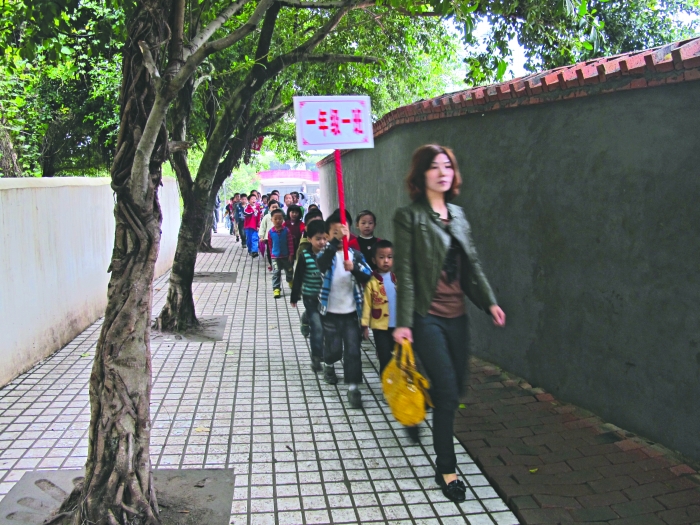 為了保證安全,孩子們在老師帶領(lǐng)下錯(cuò)峰上下學(xué)……