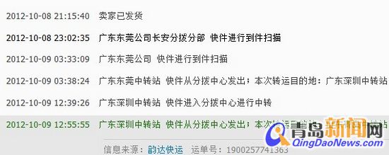 ????青島新聞網(wǎng)訊 從廣東深圳到山東青島,普通快遞只需三四天,而近日市民王先生(化名)卻遇到了一件蹊蹺事。2012年10月12日,他通過(guò)青島新聞網(wǎng)投訴平臺(tái)0532-68873738反映道,2012年10月8日網(wǎng)購(gòu)的、已發(fā)貨四天的貨品,自10月9日起,在快遞方韻達(dá)快遞網(wǎng)上貨單查詢的記錄便不再更新。他電話咨詢韻達(dá)快遞總部,卻得到不知何時(shí)到貨的答復(fù)。事情的始末究竟如何,記者對(duì)此事進(jìn)行了采訪。