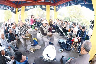 ????■市民在文化公園新近整治的涼亭里演唱京劇片段。去年和今年持續(xù)的市容環(huán)境整治活動(dòng)使得文化公園發(fā)生了很大變化,為周邊居民提供了良好的休閑娛樂去處。 傅學(xué)軍 攝