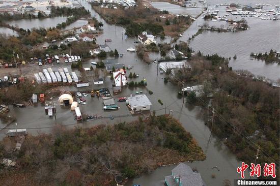 美國空軍向媒體提供了新澤西州海岸遭受颶風(fēng)“桑迪”襲擊后的航拍圖片。圖為10月30日,航拍的颶風(fēng)“桑迪”襲擊海岸后的照片。