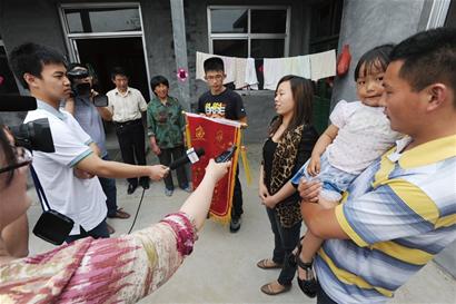 “謝謝張鵬!我們和女兒來感謝您,您是我們?nèi)胰说木让魅耍 睂⒂≈耙娏x勇為魚水之情”字樣的錦旗遞給張鵬后,抱著女兒的白會玲想要說感謝張鵬的話,但卻久久無法說出口,最后王現(xiàn)州噙著眼淚說出這句話。“快到屋里坐,孩子都累了?!睆堸i接過錦旗后,張鵬父母趕緊招呼白會玲一家到屋里坐,挨個茶碗倒上茶水招呼大家喝水,隨后又將家里的牛奶、餅干、巧克力、火腿腸等一股腦拿出來,全部塞到萱萱和她哥哥的手里。